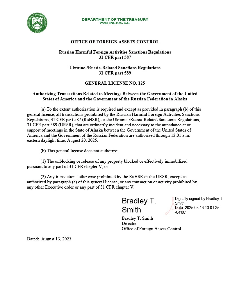 Documentul emis de Oficiul pentru Controlul Activelor Străine (OFAC) autorizează temporar, începând cu 13 august 2025, orice tranzacții „în mod obișnuit necesare” participării la întâlnirile oficiale dintre SUA și Federația Rusă, în cadrul summitului din Alaska.