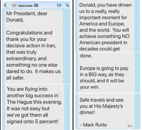 „Domnule Președinte, dragă Donald, Felicitări și mulțumesc pentru acțiunea ta decisivă în Iran, a fost cu adevărat extraordinară, ceva ce nimeni altcineva n-a îndrăznit să facă. Ne face pe toți mai siguri. Zbori spre un alt mare succes la Haga în această seară. N-a fost ușor, dar i-am convins pe toți să accepte 5%! Donald, ne-ai adus într-un moment cu adevărat, cu adevărat important pentru America, Europa și lume. Vei realiza ceva ce NICIUN președinte american n-a reușit în decenii. Europa va plăti MULT, așa cum ar trebui, și va fi victoria ta. Călătorie sigură și ne vedem la cina Majestății Sale!”